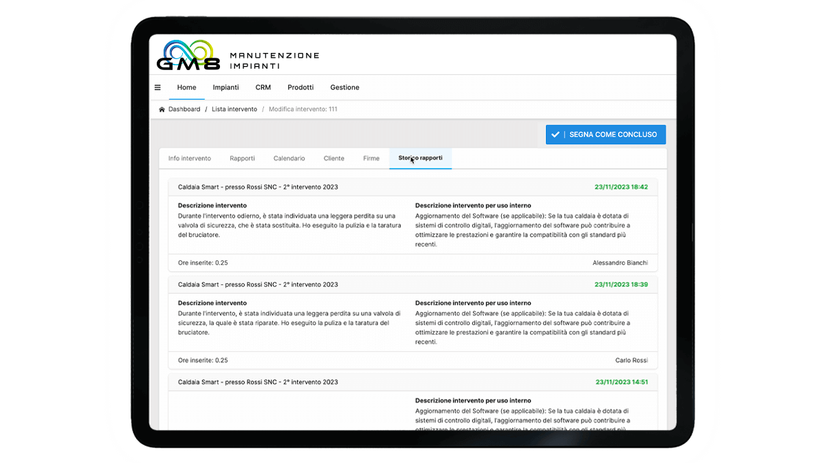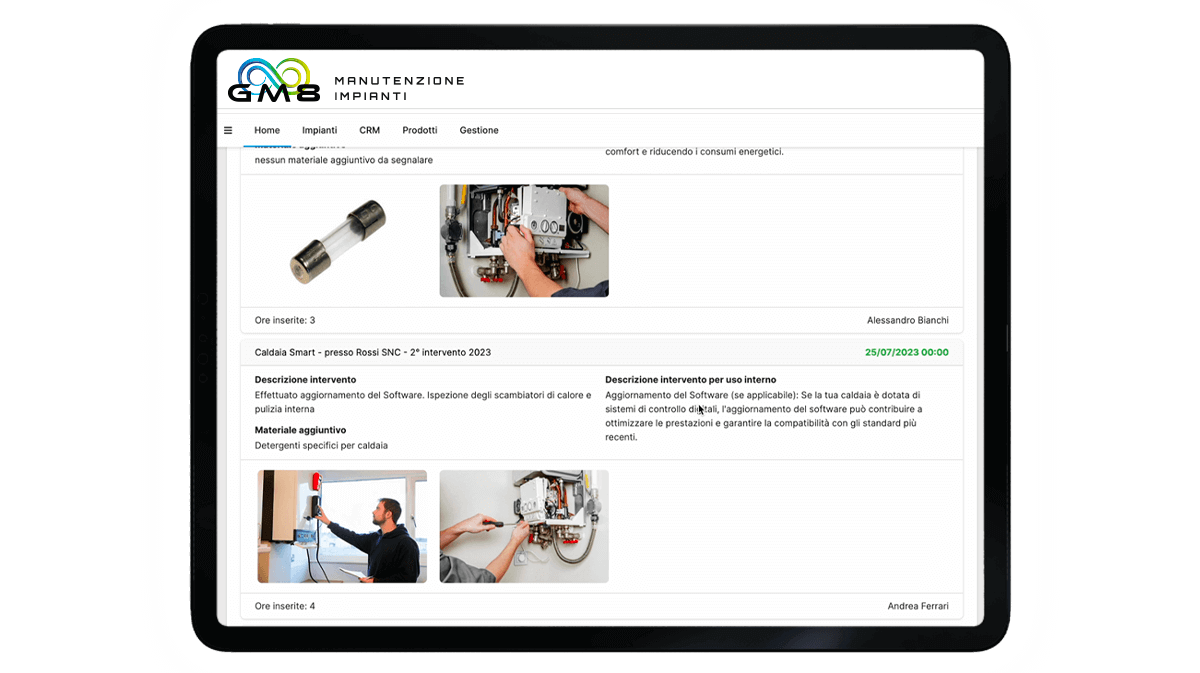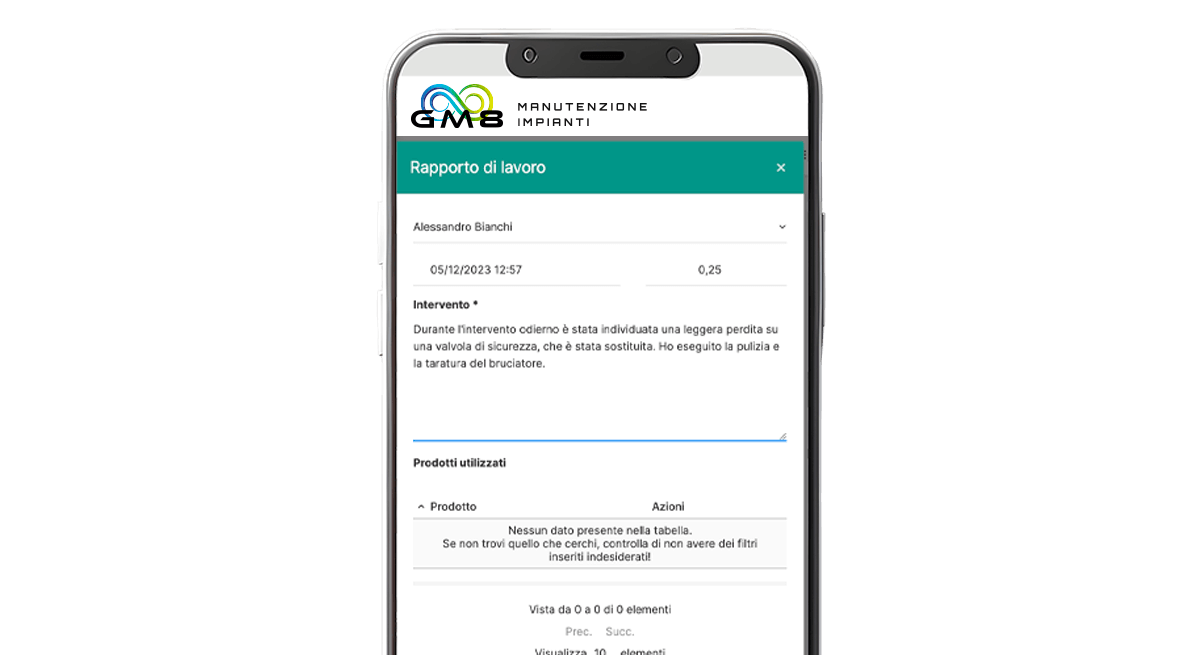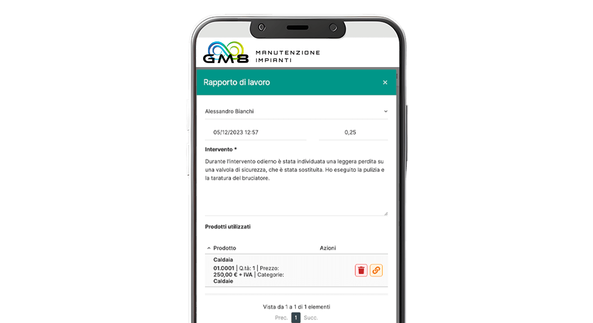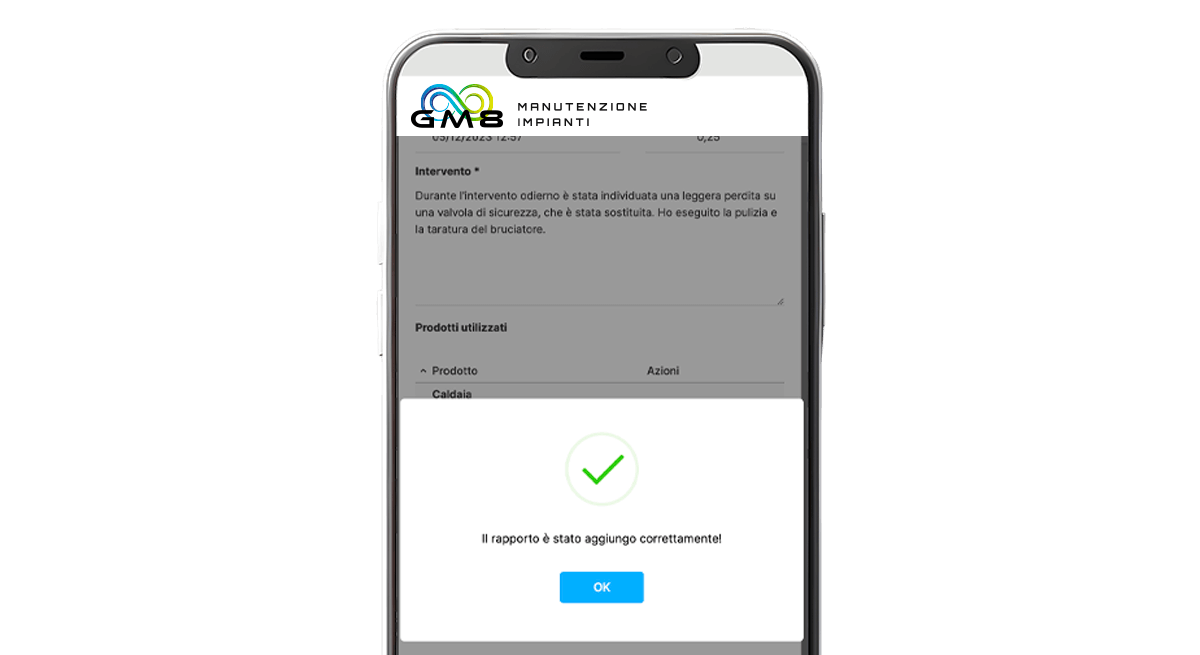 Con GM8 il tecnico può inviare il rapportino di intervento in tempo reale così che nessuna informazione venga tralasciata o persa.
